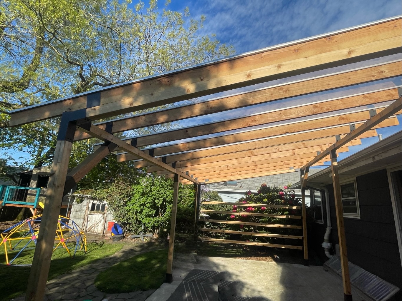 Build your own PostHugger™ Pergola with sloped roof with our USA made 1/8″ steel brackets or add a slope to an existing Pergola.