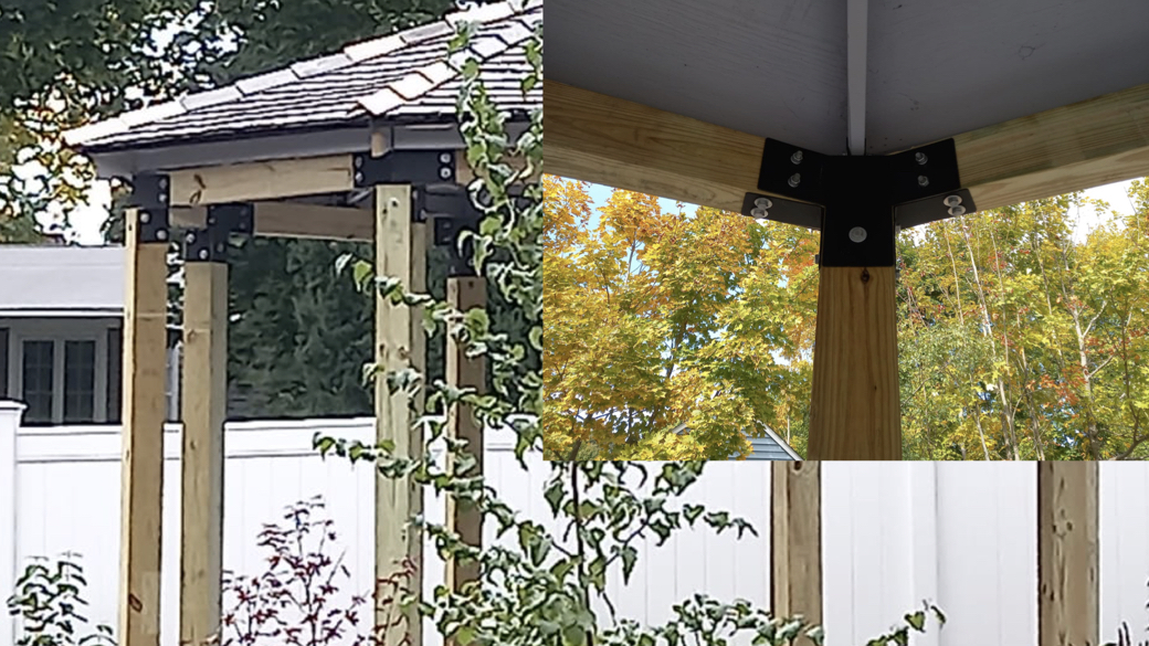 There are 6 Left-Side Underarm Brackets and 6 Right-Side Underarm Brackets. These bolt to the top of each upright post and the underside of the Hexagon. There also are 6 Inside Brackets which bolt to the inside of the upright and the top Hexagon, and 6 Outside Brackets bent to 60 degrees which bolt to the outside of the top hexagon. Other styles fail to attach to the uprights on more than one side, but our 24-Piece PostHugger™ Kit bolts onto three sides of each upright! (Scroll to the Gazebo/Pergola photo composite in this listing, from a recent pergola customer build, to view the Top Outside Bracket placement in main photo and the Inner and Underarm Brackets placement in smaller inset photo.)