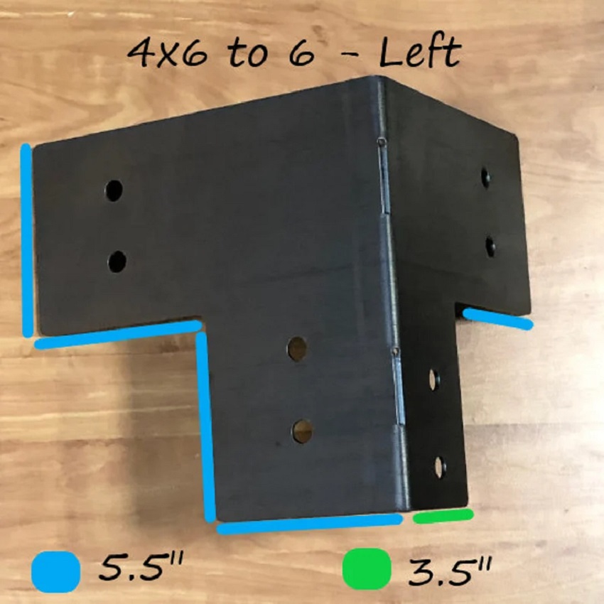 4×6 to 6 Right Outside Corner – This outside corner bracket is used where your upright post is a 4×6 and you are adding horizontal incoming 4×6 (or 2×6’s) posts which are resting on their short side and you are bolting into the wide side. We call it “Right” because this one has the 5.5″ side for the 4×6 on the right side.