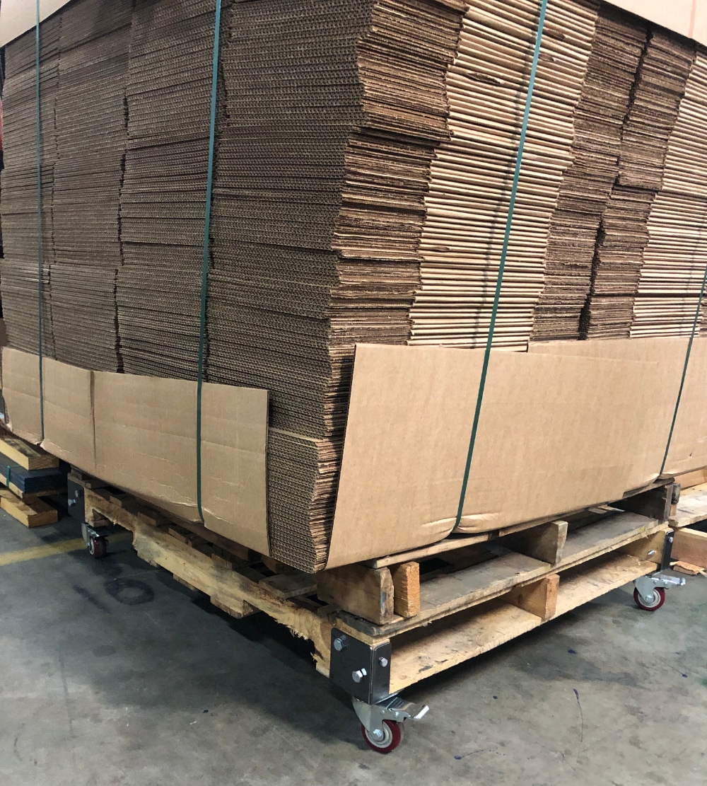 We use these Push-A-Pallets Brackets Sets in our own shop for easily rearranging large pallets and tightly packing in pallets of corrugated boxes — saves space, but easy to access . . . unlike forklifts and pallet jacks which require space for the forks to be able to pull out of the pallet.